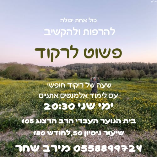ימי שני | 20:30 -21:45 | 180 ש"ח לחודש | פרטים נוספים מירב שחר : 055-8899724